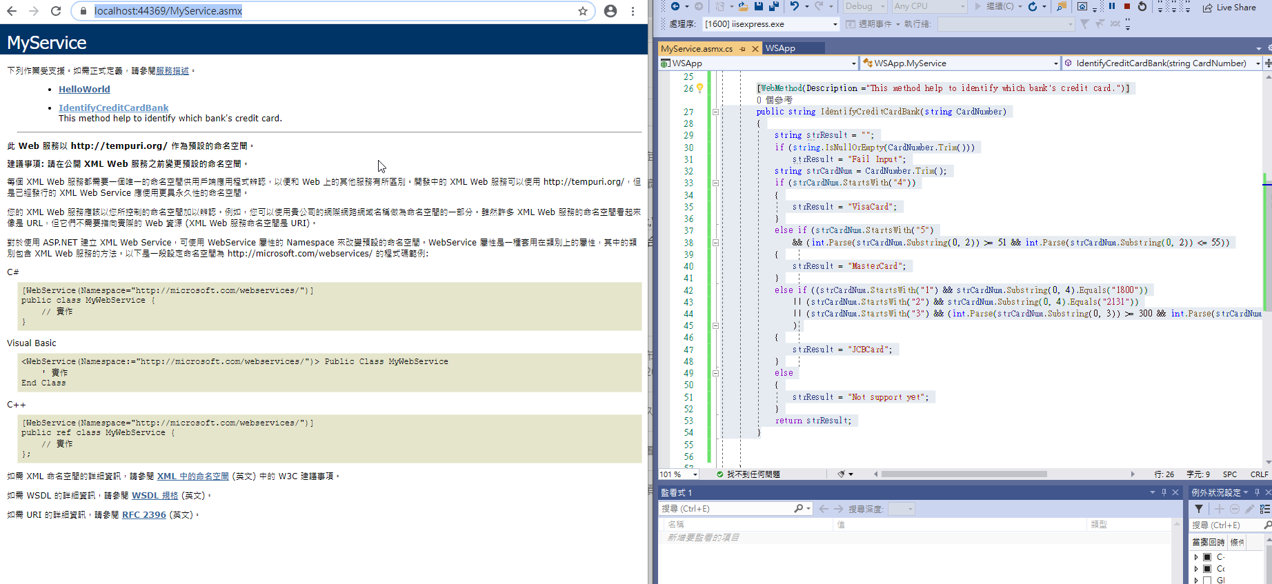 1 2 3 4 5 6 7 8 9 10 11 12 13 14 15 16 17 18 19 20 21 22 23 24 25 26 27 28 29 30 31 32 33 34 35 36 37 38 39 40 41 42 43 44 45 46 47 48 49 50 51 52 53 54 55 56 57 58 | using System; using System.Collections.Generic; using System.Linq; using System.Web; using System.Web.Services; namespace WSApp { /// <summary> ///MyService 的摘要描述 /// </summary> [WebService(Namespace = "http://tempuri.org/")] [WebServiceBinding(ConformsTo = WsiProfiles.BasicProfile1_1)] [System.ComponentModel.ToolboxItem(false)] // 若要允許使用 ASP.NET AJAX 從指令碼呼叫此 Web 服務,請取消註解下列一行。 // [System.Web.Script.Services.ScriptService] public class MyService : System.Web.Services.WebService { [WebMethod] public string HelloWorld() { return "Hello World"; } [WebMethod(Description ="This method help to identify which bank's credit card.")] public string IdentifyCreditCardBank(string CardNumber) { string strResult = ""; if (string.IsNullOrEmpty(CardNumber.Trim())) strResult = "Fail Input"; string strCardNum = CardNumber.Trim(); if (strCardNum.StartsWith("4")) { strResult = "VisaCard"; } else if (strCardNum.StartsWith("5") && (int.Parse(strCardNum.Substring(0, 2)) >= 51 && int.Parse(strCardNum.Substring(0, 2)) <= 55)) { strResult = "MasterCard"; } else if ((strCardNum.StartsWith("1") && strCardNum.Substring(0, 4).Equals("1800")) || (strCardNum.StartsWith("2") && strCardNum.Substring(0, 4).Equals("2131")) || (strCardNum.StartsWith("3") && (int.Parse(strCardNum.Substring(0, 3)) >= 300 && int.Parse(strCardNum.Substring(0, 3)) <= 399)) ) { strResult = "JCBCard"; } else { strResult = "Not support yet"; } return strResult; } } } |