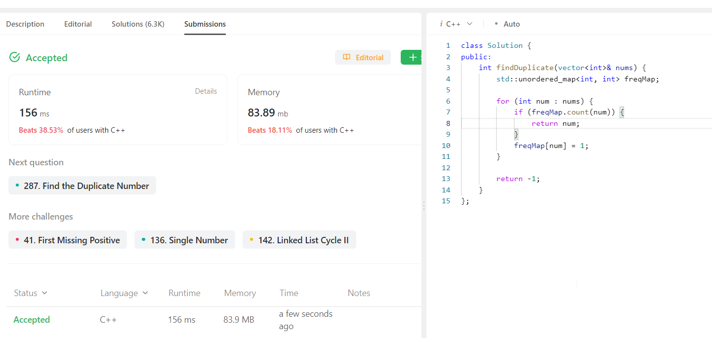 1 2 3 4 5 6 7 8 9 10 11 12 13 14 15 | class Solution { public: int findDuplicate(vector<int>& nums) { std::unordered_map<int, int> freqMap; for (int num : nums) { if (freqMap.count(num)) { return num; // 找到重复数字 } freqMap[num] = 1; } return -1; } }; |