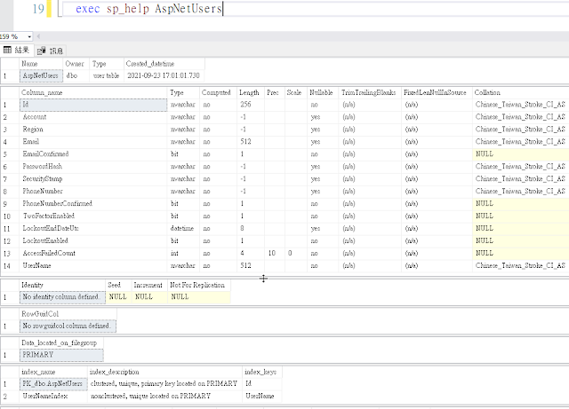 預設我們可以去觀察Identity自動幫我們建立好的資料表結構