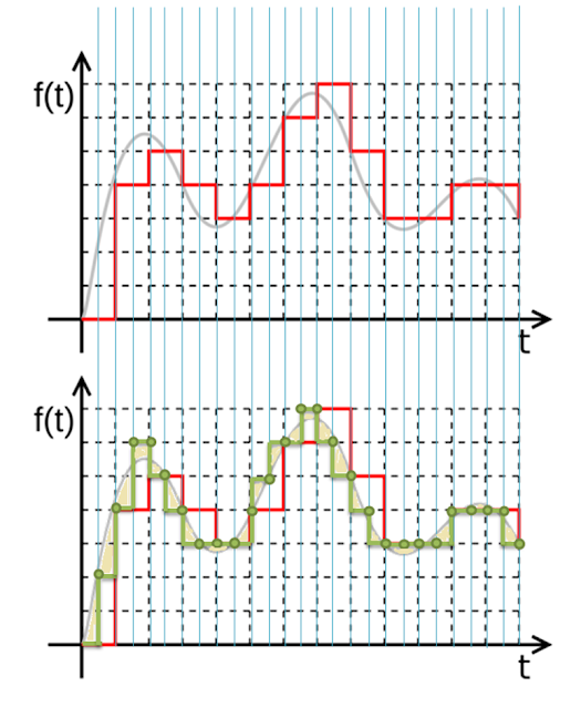 如果時間軸的取樣快一倍,訊號軸的量化不變,請畫出還原後的訊號圖,並標示和原圖形的誤差。