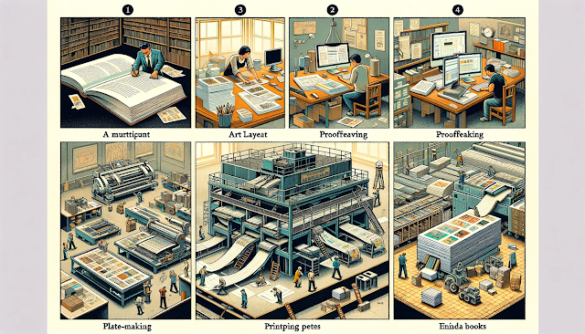 書稿內容確立後,出版商會進行印刷方式、版面大小、印刷要用彩色還是灰階(通常一開始就會先和作者確立,畢竟成本有差。)、印刷用紙。會幫作者安排行銷、美術設計師、編排的人員做相關設計安排像是頁面方向、版面尺寸、邊界設定、書名、章節、頁碼做校訂確認,封面設計,出版社則是會做ISBN申請。