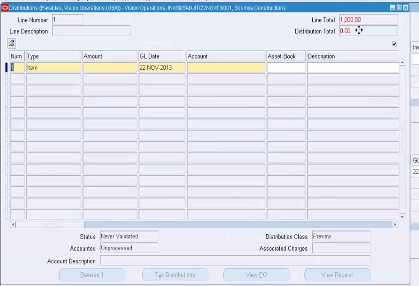 輸入金額為 1000。一旦您的行級信息填寫完畢,讓我們進入分配。