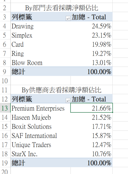 將上面的Pivot Table直接複製下來,依樣畫葫蘆產生「By供應商去看採購淨額佔比」
