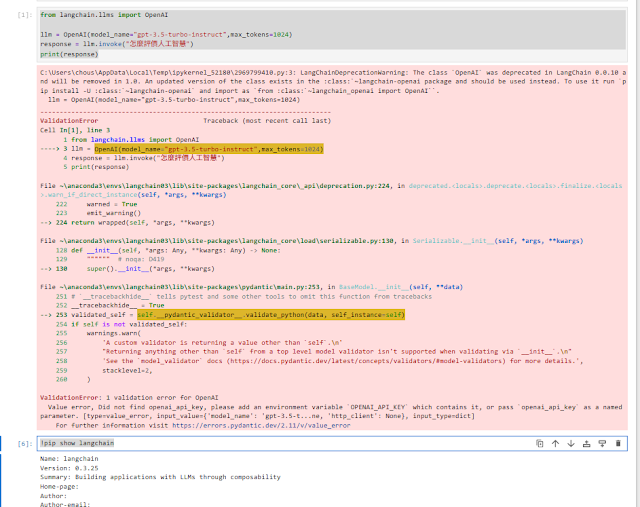 1 2 3 4 5 6 7 8 9 10 11 12 13 14 15 | import openai import os from dotenv import load_dotenv, find_dotenv _ = load_dotenv(find_dotenv()) # read local .env file openai.api_key = os.getenv('OPENAI_API_KEY') from langchain.llms import OpenAI llm = OpenAI(model_name="gpt-3.5-turbo-instruct",max_tokens=1024) response = llm.invoke("怎麼評價人工智慧") print(response) !pip show langchain |